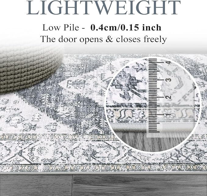 - Functional Lightweight Rug - Lahome ultra-thin rugs are made with everyday use in mind and high-traffic areas. 0.15 inches thickness allows for convenient placement in hallway, kitchen, entryway and underneath furniture. The door opens and closes freely
