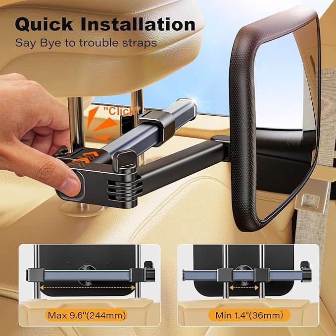 - [Always Stable with 3s Installed] The baby car mirror rear facing uses the hook clip design without any cumbersome straps. Just clamp the headrest pole to form a triangular fixation. The mirror can be stable even on rugged country roads. No more adjusting the mirror again and again.