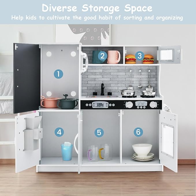 - 【ASTM & CPSIA Certified & Child Secure Design】Made of solid MDF material, this toy kitchen sets is stable and sturdy for long service life. What’s more, the equipped anti-toppling device attaches the kids play kitchen to the wall tightly, avoiding accidental falling.