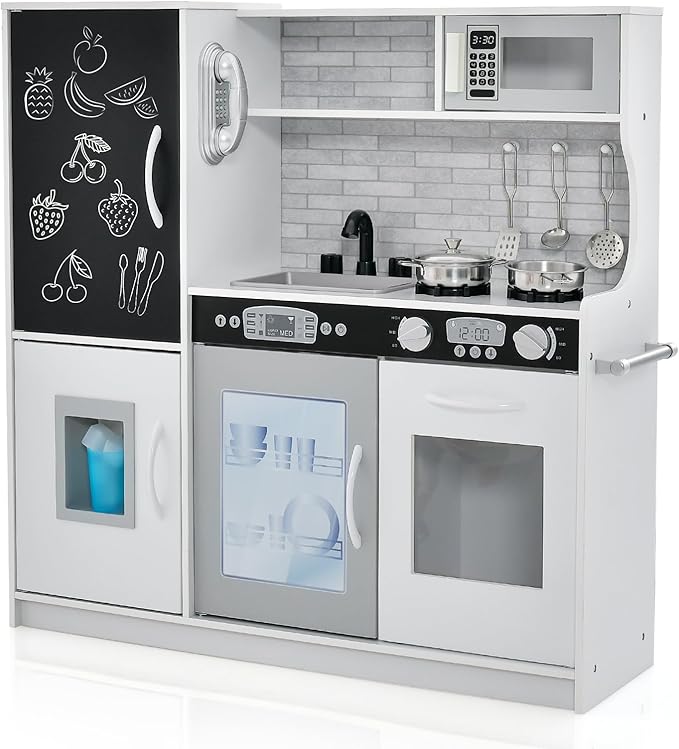 - 【Fun Chalkboard Surface】 With a built-in blackboard, this HONEY JOY kids kitchen playset allows kids to write down the menu today! Stylish backsplash with realistic microwave, fridge, freezer, and dishwasher adds a modern appeal and create an immersive play experience for children and kids.
