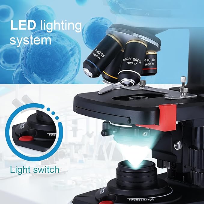 - [Combined magnification] 40X-2500X microscope, four rotating DIN achromatic objectives are 4X, 10X, 40X(S), 100X(S, Oil), with 10X and 25X eyepieces can magnify 40X, 100x, 250x, 400x, 1000x, 2500x