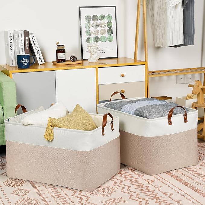 - 【Unique Design & Modern & Decorative】Set of 2 large storage baskets, dimensions(each): 22(L) x 15(W) x 13(H) inches. Fabric baskets for organizing bring you organizing convenience and a sweet home. Great for socks, underwear, books, magazines, toys, baby clothes, pet products, wipes, towels, decorations, office supplies, DVDs, and gifts. The Large Fabric baskets with neutral colors can match a lot of home styles - keeping your home nice and tidy.