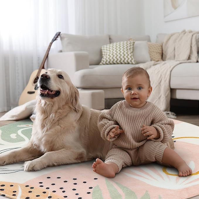 Lahome Pink Round Area Rug - 4Ft Washable Non-Slip Small Circle Boho Throw for Bedroom, Low-Pile Soft Cute Nursery Girls Room, Botanical Print Indoor for Dorm Bathroom