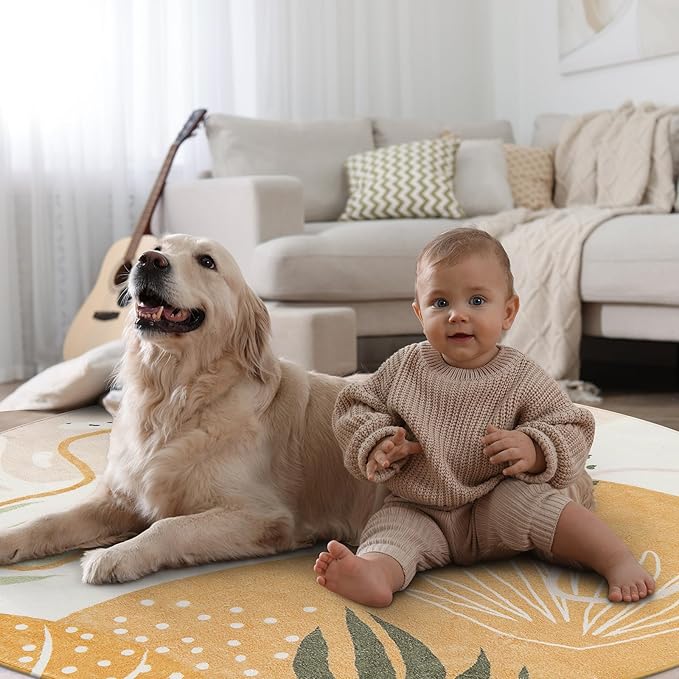 Lahome Boho Round Rug - Circle Rug 3Ft Washable Non-Slip Ultra-Thin Round Entryway Rug Throw Soft Small Circle Area Rug for Bathroom, Botanical Print Circular Rugs for Bedroom Nursery Kids Room Sofa