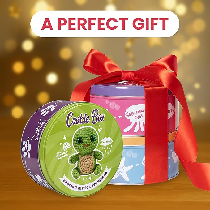 Cookie Box Crochet Kit for Beginners - Learn to Craft Amigurumi Stuffed Animals - Knitting Gift for Kids and Adults - Beginner-Friendly Yarn - Stitch-by-Stitch Video Tutorial - Turtle Hugo