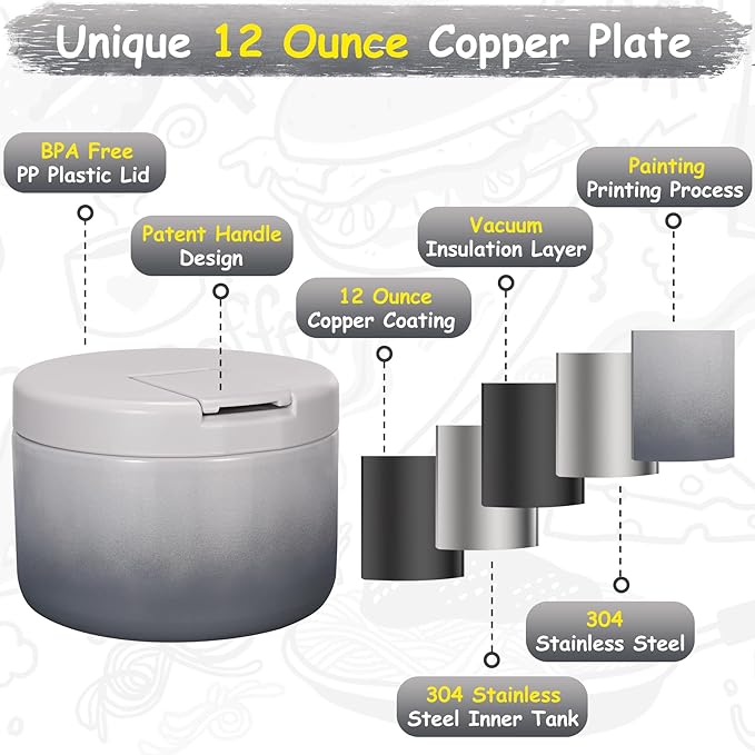 12oz Insulated Vacuum Food Jar with Buckle Lid Wide Mouth Soup Thermo for Hot Food Kids Leakproof Stainless Steel Lunch Container (Gradient Grey, 12OZ)