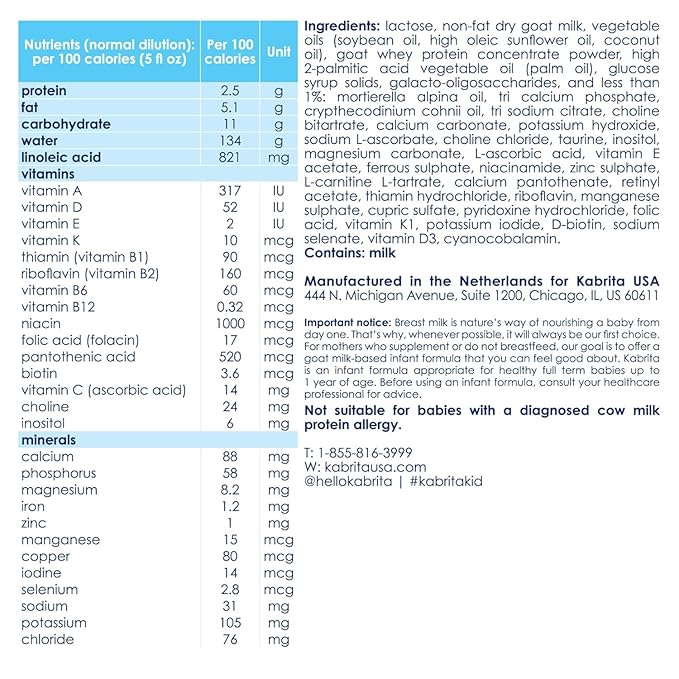 - CLEAN & SAFE EUROPEAN FORMULA MEETS FDA REQUIREMENTS: Kabrita is the first and only goat milk formula to meet all rigorous FDA requirements & strict European safety standards. Our baby formula is made with no GMOs, growth hormones, corn syrup, or anti-biotics.