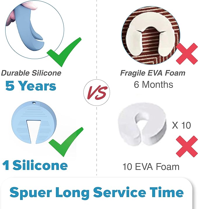 - ๐๐จ๐ง๐ ๐๐๐ซ๐ฏ๐ข๐๐ ๐๐ข๐ฆ๐: Neobay finger pinch guard is made from durable silicone which can serve up to 5 years, about 10 times longer than foam door stopper. Perfect for continuously protecting the little hands and fingers of your baby, toddler, or child from getting pinched or jammed due to a door closing.