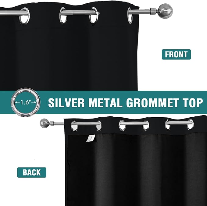 - SET DETAILS: Set of 2 total blackout curtain panels per package. Each lined curtain measures 52 inch wide by 54 inch long with 8 silver metal grommets (1.6 inch inner diameter) on top, easy to install and slide.