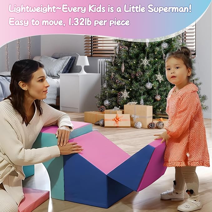 - TWO WAYS TO PLAY:The slope climbing toys in the toddler foam climbing blocks can be folded into a square or put down to use as a slide, which not only increases kid's interest but also creates building ability for them.Brightly colored foam blocks can not only be combined into various shapes, but also become seats for little princesses and princes!