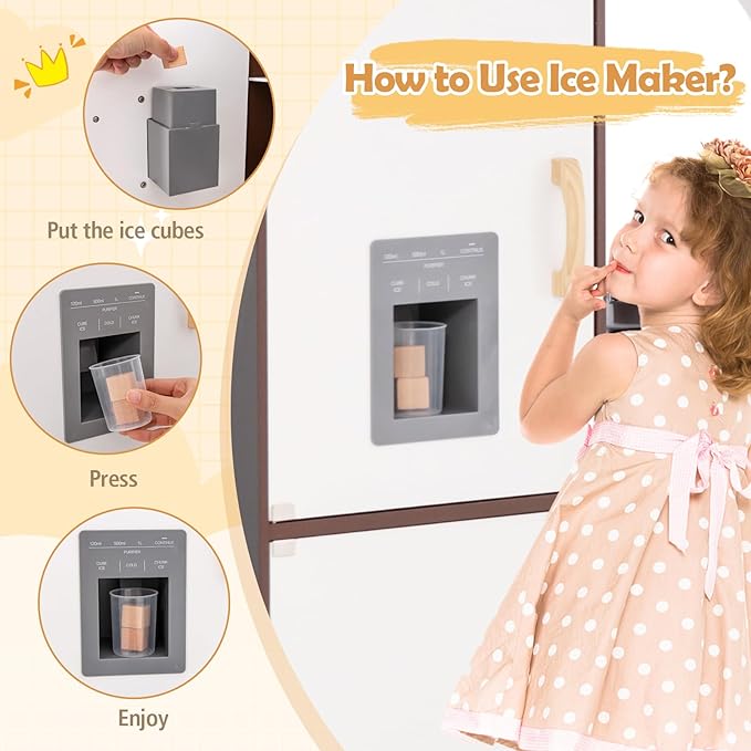 - Vivid Sounds for Realistic Effect: By rotating the knobs that make click sounds, kids can turn on the heat and learn to make delicious food for realistic cooking experience. What’s more, the ice maker also makes realistic sounds when pressed. But how to use it? Just put the ice cubes, press to get ice cubes and enjoy.