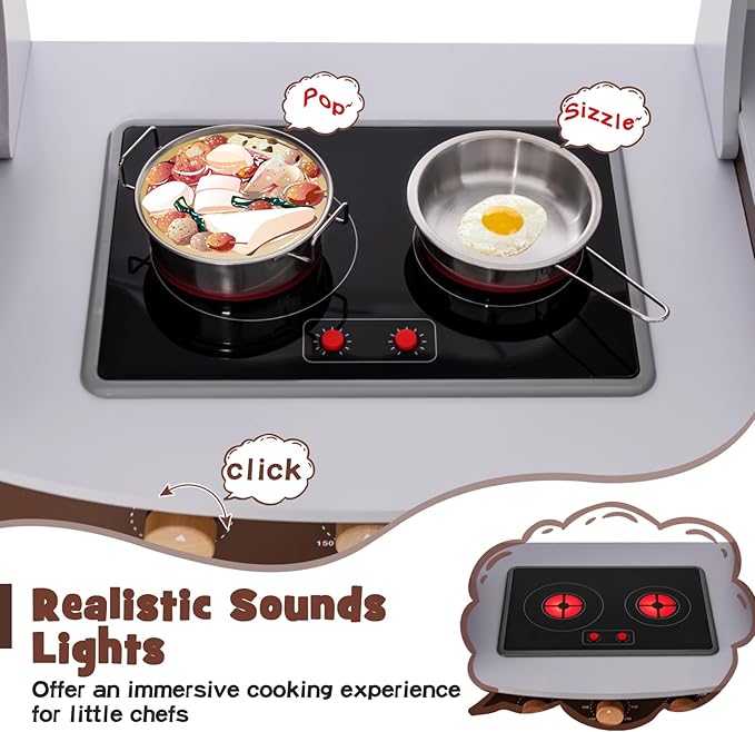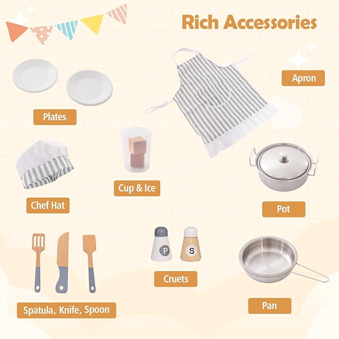 - Durable Corner Play Kitchen: This toddler kitchen playset is made with wooden structure with stable base, ensuring high stability and durability. Plus, it is certificated by ASTM and CPSIA for reliable use. And there are no sharp edges to protect your child's delicate skin. More, the L-shaped design makes it perfectly fit in kids room, play room or living room.