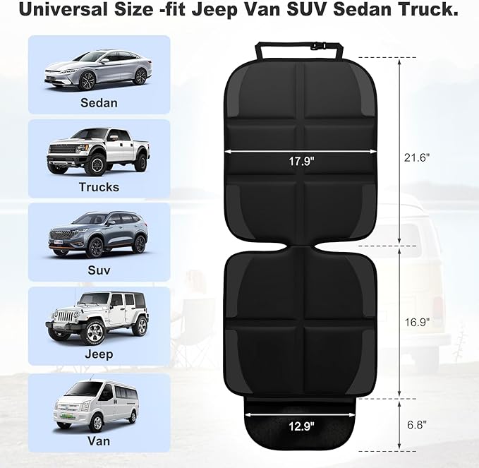 - The whole dimension of the auto seat protector carseat is 17.9 x 46.45 inch, the seat:17.9 x 16.9 inch, the back: 17.9 x 21.6 inch, and the mesh pocket: 12.9 x 6.8 inch. Universal fit Jeep Van SUV Truck