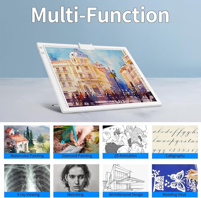 - 【 Carry Bag, Built-in Stand and Top Magnetic Clip 】 The carrying bag is padded and lined with soft anti-scratch fabric, which helps to keep the screen protected and make it more durable. The built-in stand is hidden on the back of the A3 light pad, foldable and 6 levels adjustable. The built-in stand and the magnetic clip on light pad can hold paper and diamond painting canvas easily, you can unfold the stand when you are doing diamond painting or vinyl weeding to your most comfortable posture.