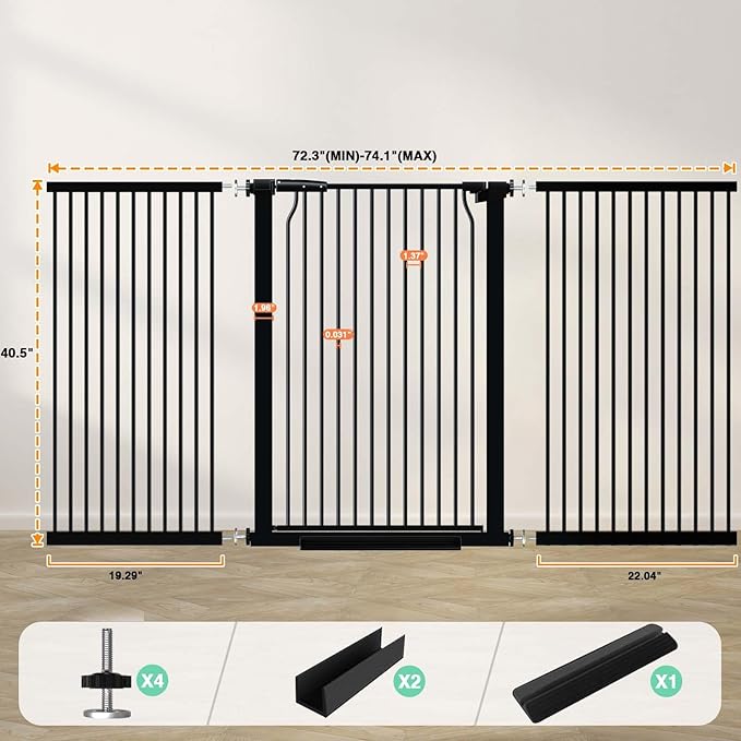40.5" Extra Tall Baby Gate for Doorway, 72.3"-74.1" Extra Wide Long Pet Gate, No Drill Pet Safety Barrier Metal, Pressure Mounted Safety Child Gate for Stairs Walk Thru Kids or Pet Black