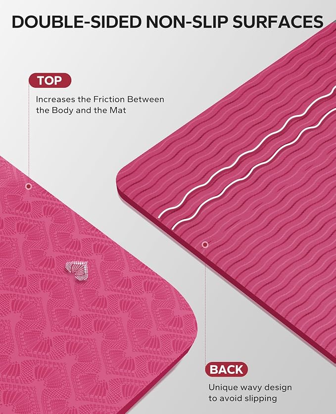 - Double-Sided Non-Slip Design: Our extra wide yoga mat features a double-sided non-slip surface to keep you stable and secure during your practice without worrying about slipping or sliding. The unique wave pattern on the bottom enhances grip on a variety of surfaces, ensuring your mat stays securely in place even during the most challenging yoga poses. Note:Not for use on carpet