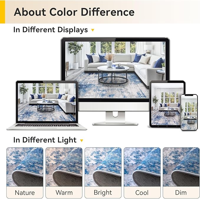 - Soft Modern Area Rug: this area rug with a unique silk-like luster and a dense texture is made of low-pile soft material which feels great underfoot. With its low pile, the fibers are short and tightly packed together, creating a smooth and even surface. that's comfortable to step on barefoot.