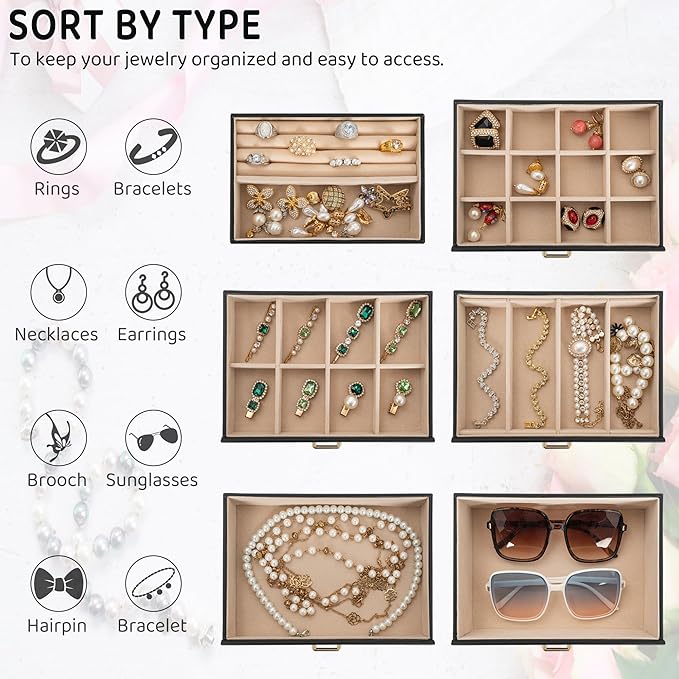 - 【PERFECT CAPACITY,JUST TOP LAYER CAN BE LOCKABLE】:With 6 versatile pull out drawers, this black jewelry box can store jewelry accessories, such as rings, earrings, necklaces, chains, bracelets, and so on. One deeper drawer is designed for large jewelries. For privacy,there have a key to lock the top layer