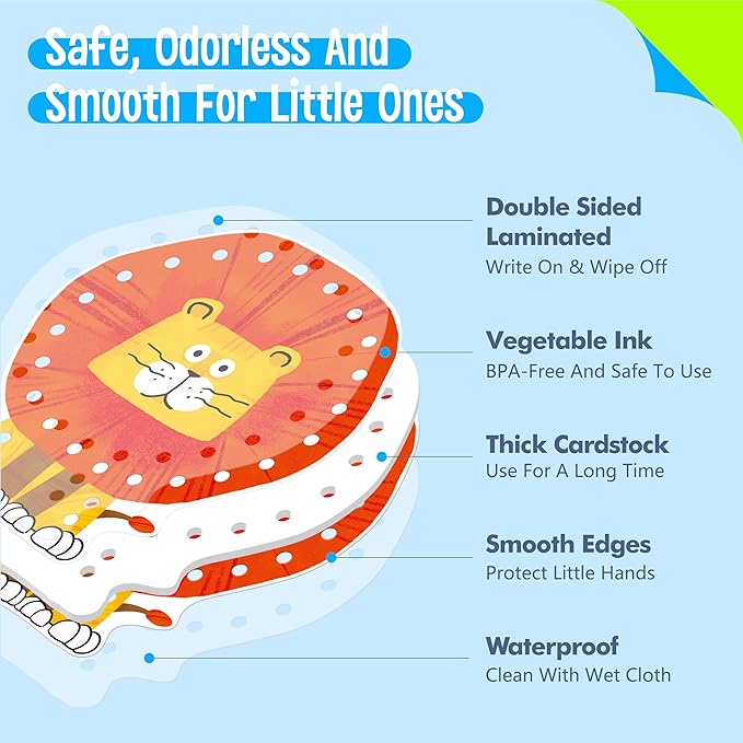 - Cute Animal Patterns: The pattern covers diverse wild animals, like tiger, zebra, hippo, monkey and other lovely animals. The patterns on cards are colorful, big and vibrant. The holes are clearly cut and easy for preschoolers to work with. The strings are easy for children to use and fit into the holes easily.