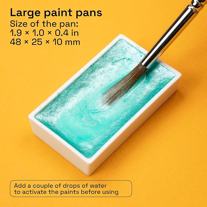 - Travel-Friendly Design: Designed for artists on the go, this travel metallic watercolor paint set is compact yet comprehensive, making it easy to create art anywhere. The sturdy case protects the metallic paints and includes a removable palette for convenience.