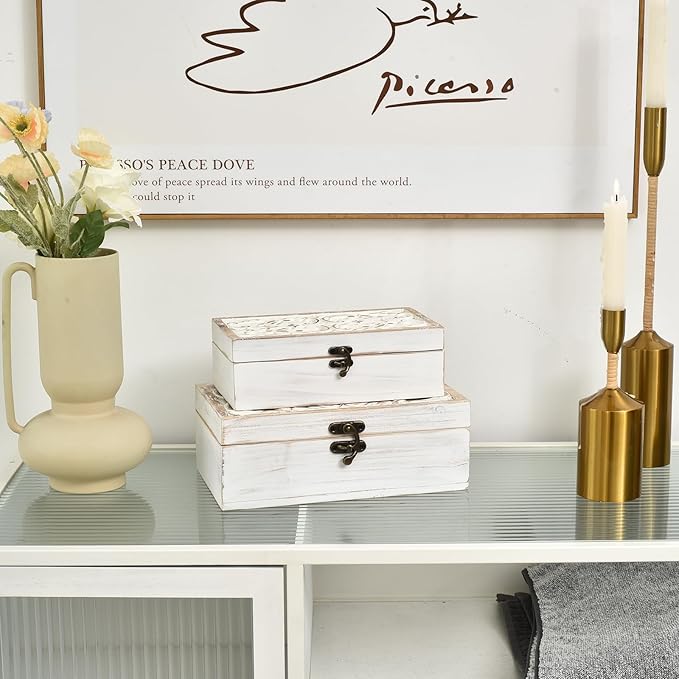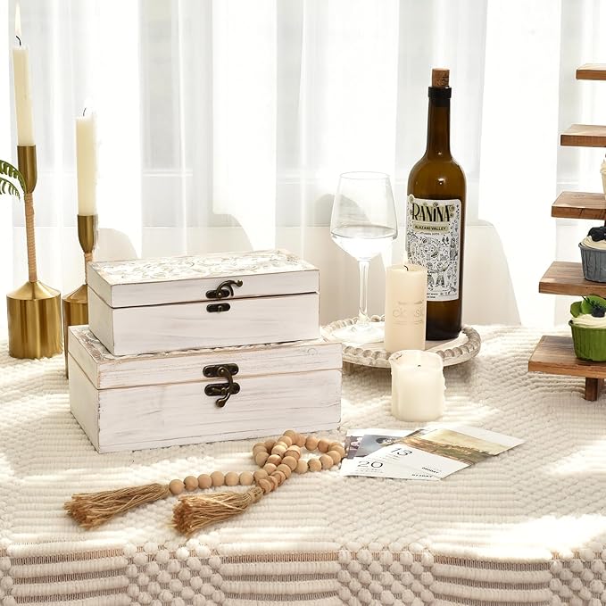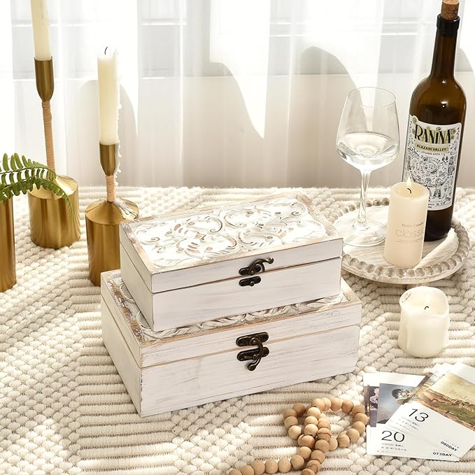 - Rustic Farmhouse Charm: Embrace the rustic elegance of these decorative boxes, designed to evoke a sense of nostalgia and tranquility. The hand-carved motifs on the lids beautifully capture the essence of farmhouse aesthetics, while the distressed white wash finish adds a vintage touch. Every glance at these boxes will transport you to the idyllic countryside, creating an ambiance of warmth and charm in your home.