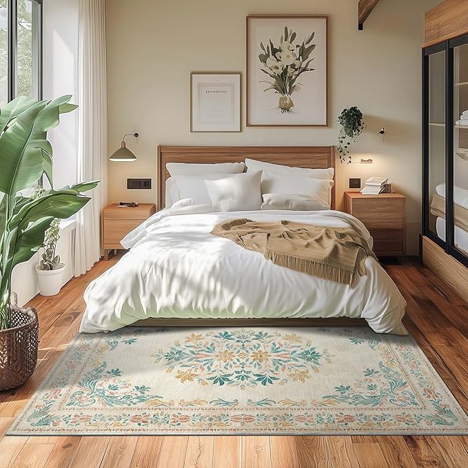 jinchan Floral 4x6 Area Rugs for Nursery - Machine Washable Vintage Distressed Design Soft Ultra-Thin Low-Pile Non-Slip Kids Carpet for Bedroom Living Room Dining Room Home Office (4x6ft,Apricot)