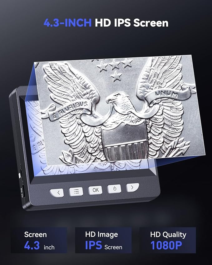 - 【Stunning Display】 - Immerse yourself in a visual feast with our coin microscope 4.3-inch HD LCD screen with 8 adjustable lights boasting over 10 million pixels. Reduce the pressure on your eyes and give your eyes a more comfortable visual experience