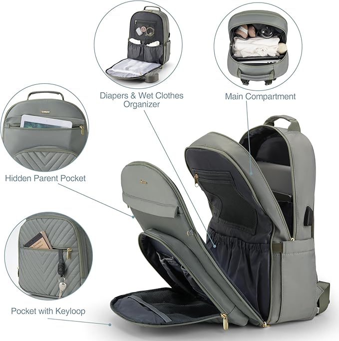 - Convenient and Thoughtful: Baby diaper bag features 15.6’’ padded laptop pocket and 12.9’’ iPad pocket in the main compartment, USB charging port, 2 built-in stroller straps, waterproof pocket, back anti theft pocket, dual zippers for easy access and closure even with one hand! Also we have added a luggage sleeve on the back so it can easily slide over a carryon luggage while on the go.
