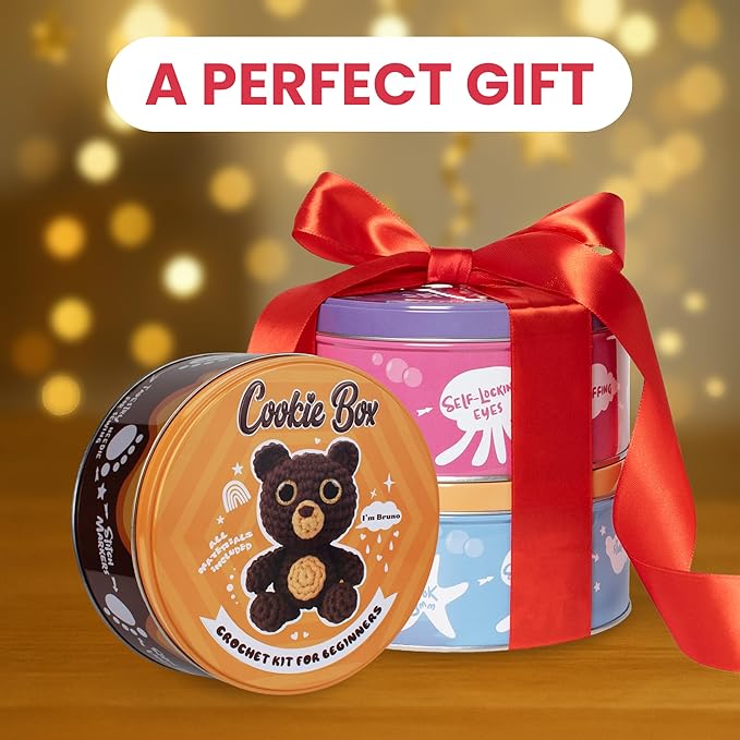 Cookie Box Crochet Kit for Beginners - Learn to Craft Amigurumi Stuffed Animals - Knitting Gift for Kids and Adults - Beginner-Friendly Yarn - Stitch-by-Stitch Video Tutorial - Bear Bruno