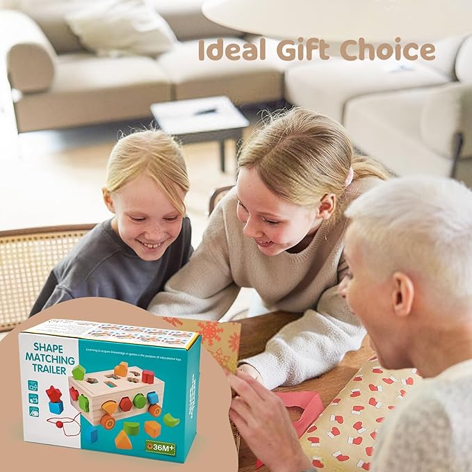 Shape Sorter - Montessori Wooden Learning Shapes Toy with 17 Shape Blocks - Early Education and Sensory Development Storage Pull Car for Toddlers, SSC03