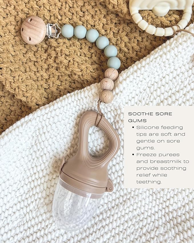 - ✔️ SOOTHE SORE GUMS: The silicone feeding tips are soft & flexible, yet durable so they’re gentle on sore gums. Freeze cubes of purees and breastmilk and place inside the feeding tips to provide soothing relief for babies while they’re teething. The set includes 2 extra feeding tips.