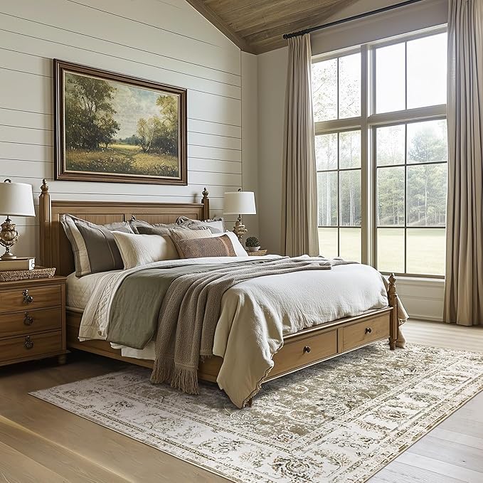 jinchan Washable Area Rug 5x7 Ultra-Thin Low Pile Non Slip Stain Resistant Soft Faux Wool Floral Distressed Vintage Carpet for Bedroom,Living Room,Dining Room,Kitchen,Nursery(Taupe, 5' x 7')