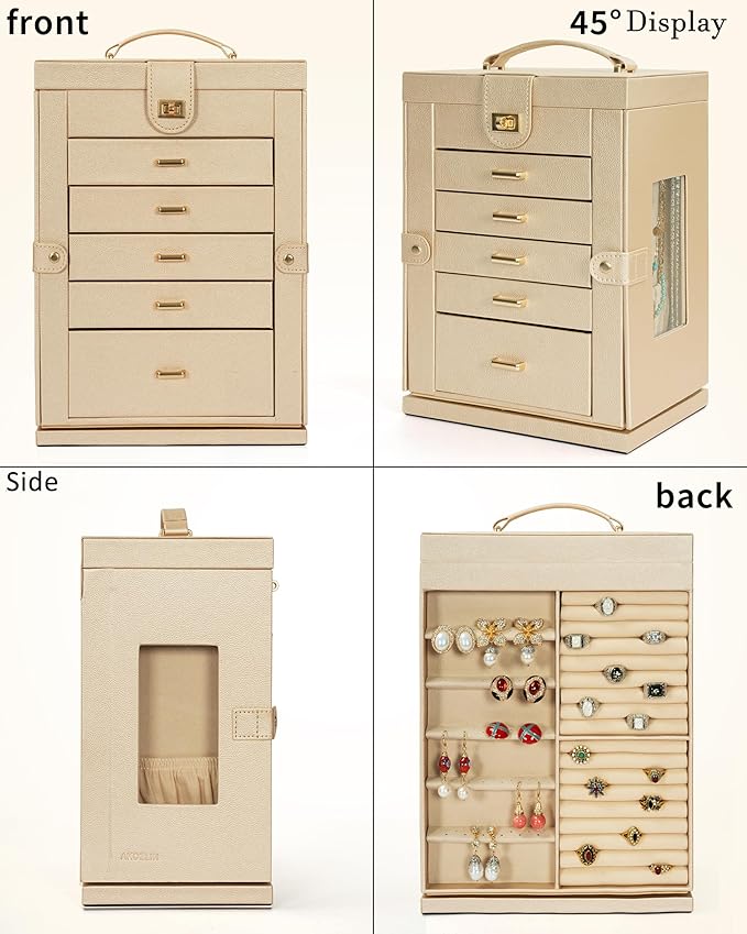 AKOZLIN Jewelry Box 6-Tier Organizer Functional 360° Rotating Jewelry Storage Case for Women Girls Ring Necklace Earring Bracelet Holder with Mirror