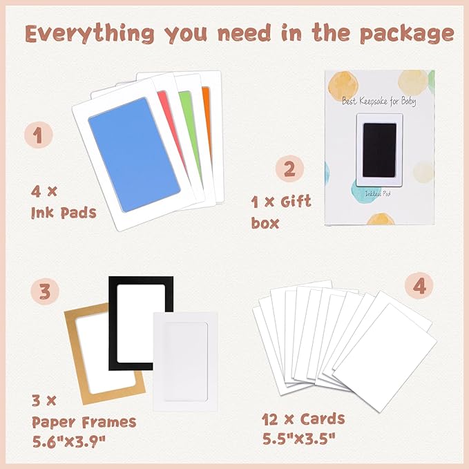 • 【Easy to use】: This baby fingerprint kit are very easy to use and it takes less than a minute to make these precious newborn keepsakes. Pay attention to which side is the ink side. The ink side faces the imprint card, and then gently press hand or foot on the other side with the plastic layer. After the imprint is completed, wait for the ink to dry before touching it. It usually takes 2 hours. Practice on plain paper with clean hands or feet before use to ensure you can make better stamp.