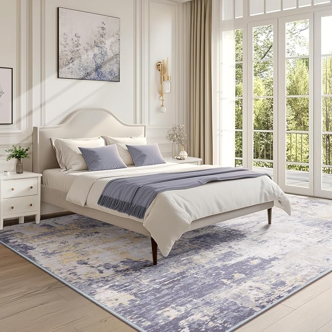 Washable Area Rugs 6'x9' Non-Slip Modern Abstract Soft for Living Room Entryway Bedroom Nursery, Print Pattern, Purple Grey Cream Yellow
