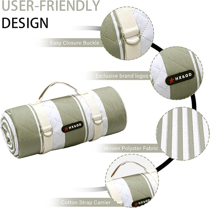 HX&OD Outdoor Picnic Blanket Extra Large, 80''*80' Waterproof Picnic Mat with Stakes Foldable Camping Blanket Portable with Carry Strap for Beach Mat (Green, 80''*80'')