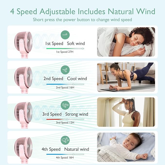 - 360°Rotate & 4 Speeds: Momcozy Baby stroller fan's head can adjust vertically and horizontally in any direction, to provide cool airflow from every direction, keeping your little one comfortable on hot days.; it comes with 3 speeds for different purposes, The fourth level is natural wind, which is more comfortable for babies.