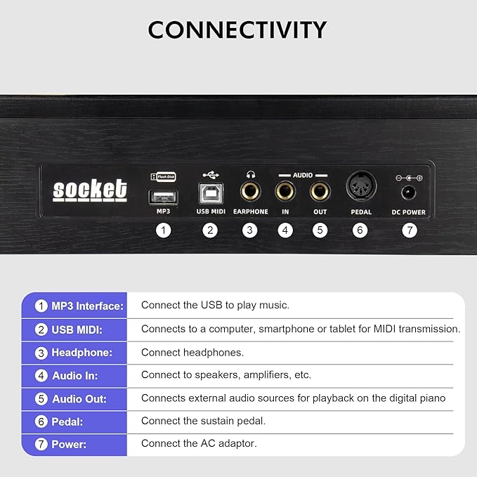 - MEDIA CONNECTION: The electric keyboard piano can be easily connected to devices such as mobile phones, tablets and computers via MIDI-USB output, and is compatible with music apps such as POP Piano,Perfect Piano for practice. The Bluetooth function allows the piano to be used as a speaker, inspiring passion for music learning.