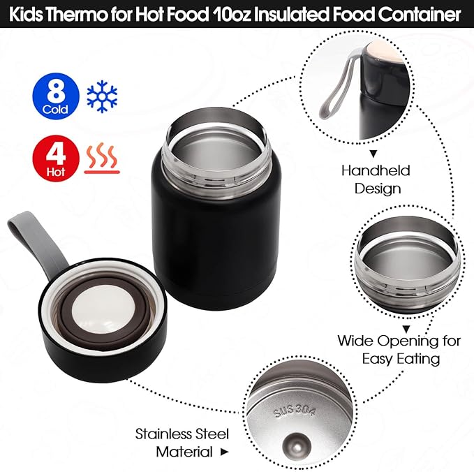 - 🖤 The food thermos measures 3.3 x 5.1 inches and the insulated food jar has a 10 oz capacity, big enough to hold your delicious soup or beverage. The insulated food jar is made of food-grade 304 stainless steel, which has good heat insulation and cold preservation properties.