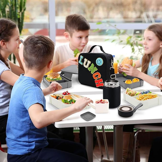 - 🖤 Our three-piece lunch bag set includes a preppy lunch box, a food thermos and a double-layered bento lunch box with cutlery and sauce cups. (Age rating: 4 years and up.) Note: Thermos only be hand washed, not in the dishwasher!