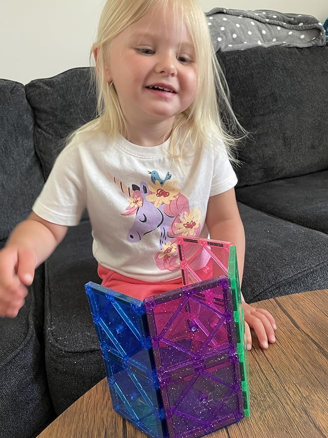 CreateOn Crayola Magnetic Tiles, Building Set for Kids, Magnetic Toys for Kids, Travel Toys, Classroom Sensory Toy Blocks, STEM & Montessori Tools for Boys & Girls Ages 3+, 14-Piece Set (Glitter)