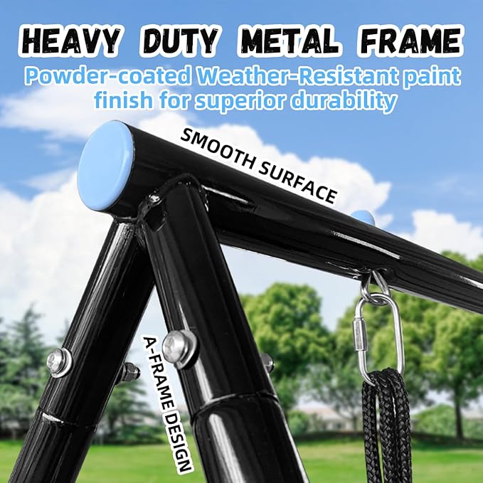 - MILITARY-GRADE DURABILITY & STABILITY: Baby outdoor swing 1680D tear-resistant Oxford fabric , Engineered Stability System, A-frame + X-brace structure (1,000lbs static/660lbs dynamic load), toddler swing 72° triangular base