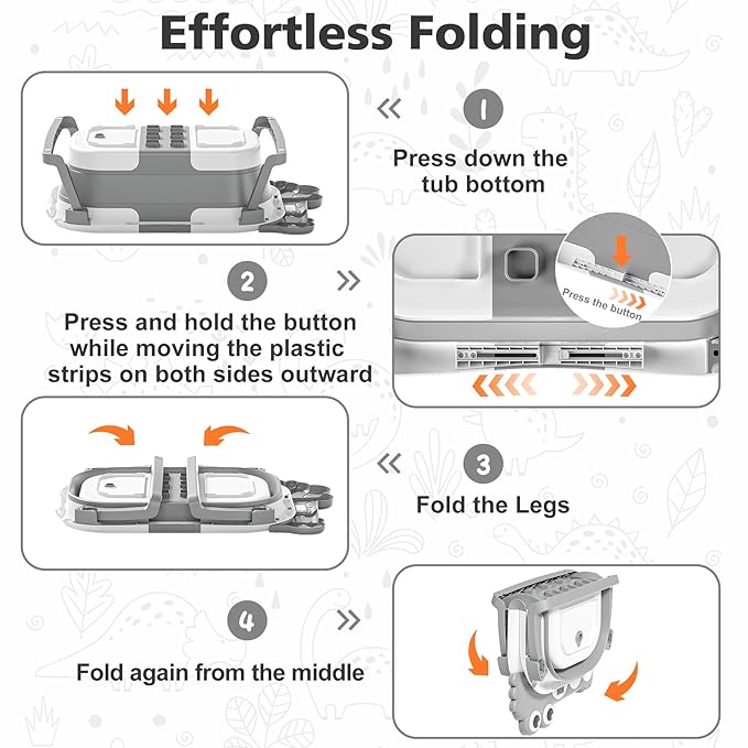 - Innovative Double-Fold Design: Our baby bathtub boasts a space-saving double-fold design, measuring under 4 inches in thickness. This allows for easy storage in tight spaces and enhances portability, perfect for both home use and travel. The off-the-floor drain with a user-friendly rubber plug ensures seamless water drainage without the need for relocation.