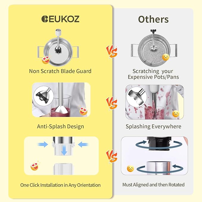 - Non Scratch Feature: Immersion blenders for kitchen, which Anti-scratch,Anti-splash Semi-wrapped blade guard designed for protecting your container,preventing splashing and keeping food from getting stuck.the sharp stainless steel blending blade guard design specifically protects non-stick cookware, scratch resistance blade guard allow you to blend directly in deep pots or pans without scratching them,choose any of your pots or pans, don't worry about scratching them.CEUKOZ upgraded 4-leaf titanium, other 2 leaf only