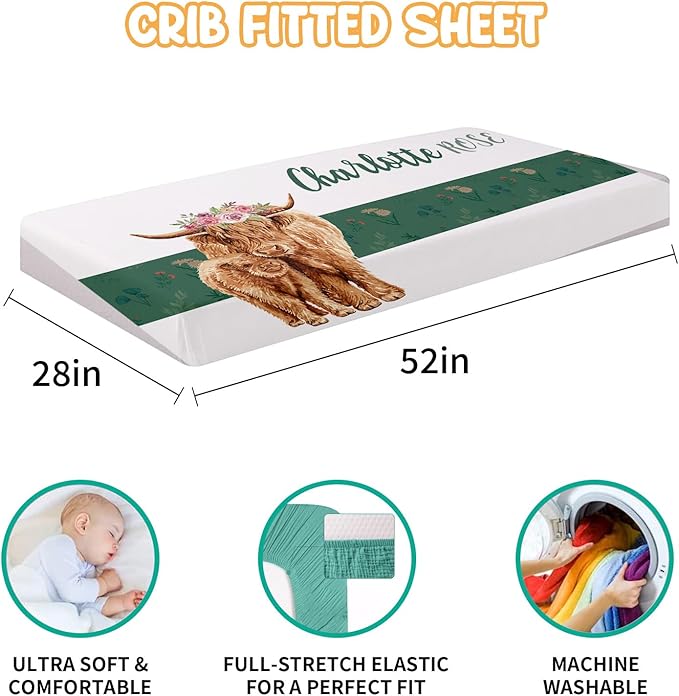 Custom Crib Bedding Set - Highland Cow Design Personalized Name Baby Nursery Bed 3 Pcs Set - Chic Soft Blanket with Dotted Backing, Sheet, Pillowcase for Newborn Girls Boys Gifts Color04