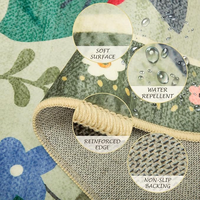 Floral 2x6 Area Rug Machine Washable Soft Print Boho Carpet Non Slip Doormat Low Pile Flower Area Rugs for Living Room Bedroom Nursery Kitchen Dining Room Indoor-Light Green