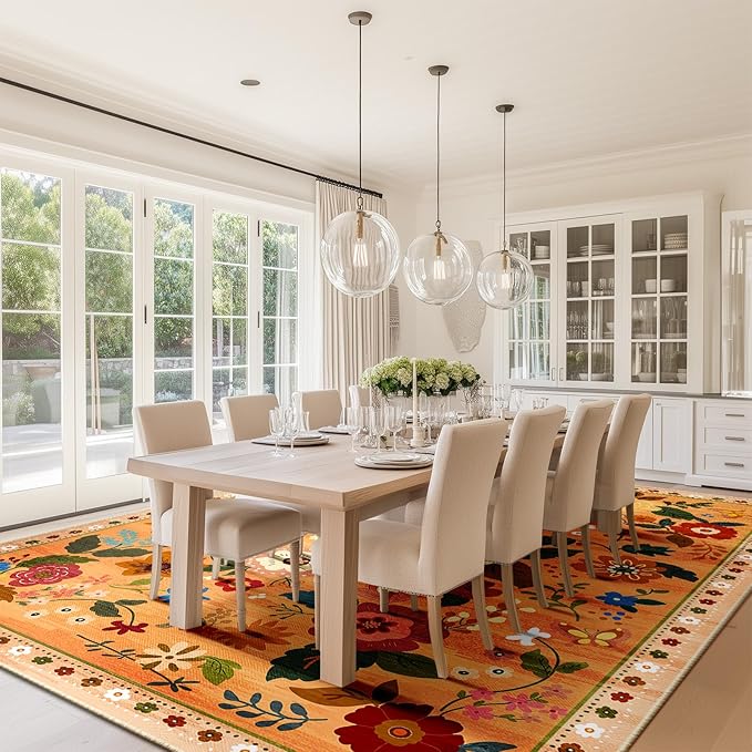 Floral 9x12 Area Rug Machine Washable Soft Print Boho Carpet Non Slip Doormat Low Pile Flower Area Rugs for Living Room Bedroom Nursery Kitchen Dining Room Indoor-Yellow/Orange