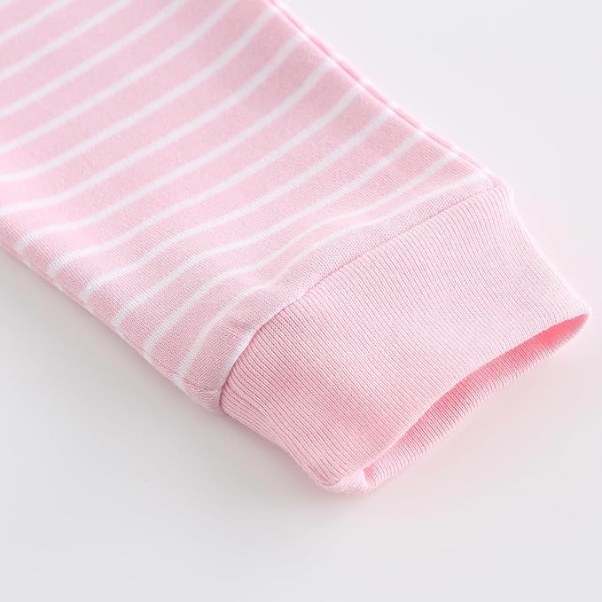 • Bodysuit and Pants Set Design 1: Bodysuit has three metal snap buttons at the bottom for easy changing. The pants have elastic and shrinkable cuffs for easy play