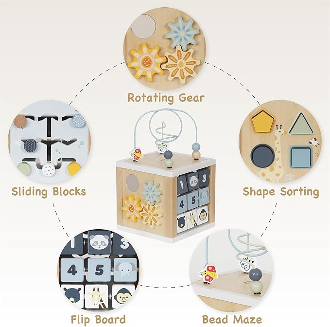- 😋【Multifunction Fun Activity Center】Combines 5 different activities in activity toddler cube:wooden bead mazes, baby shape sorter, flip board, spinning gears, sliding track. The montessori toys is best gifts kids play table toys for boys girls when birthday party, or christmas.