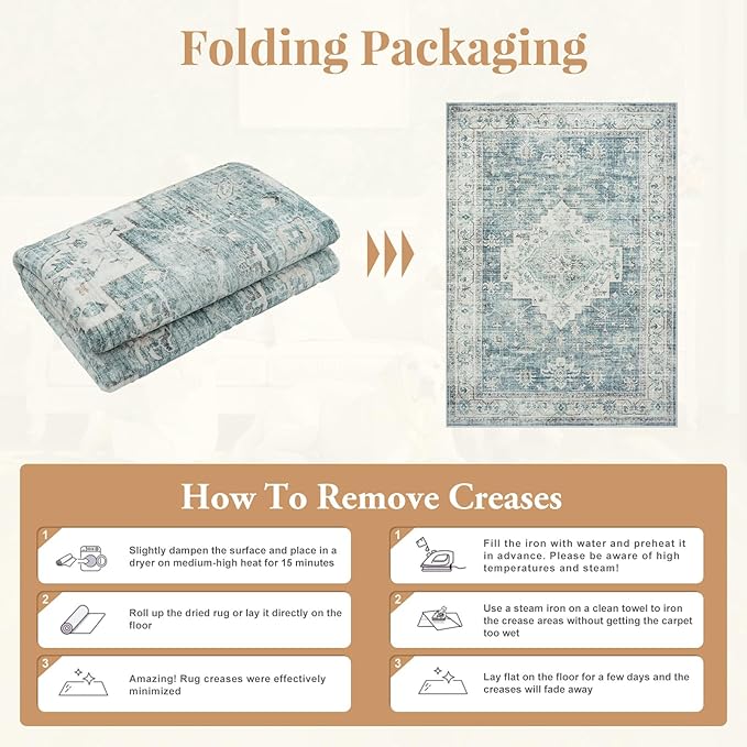 - Folding Packaging--Due to the folding during packaging, the blue area rug may have some creases upon opening. However, the edges are resistant to buckling, and the folds will disappear once the rug is laid flat and ironed.